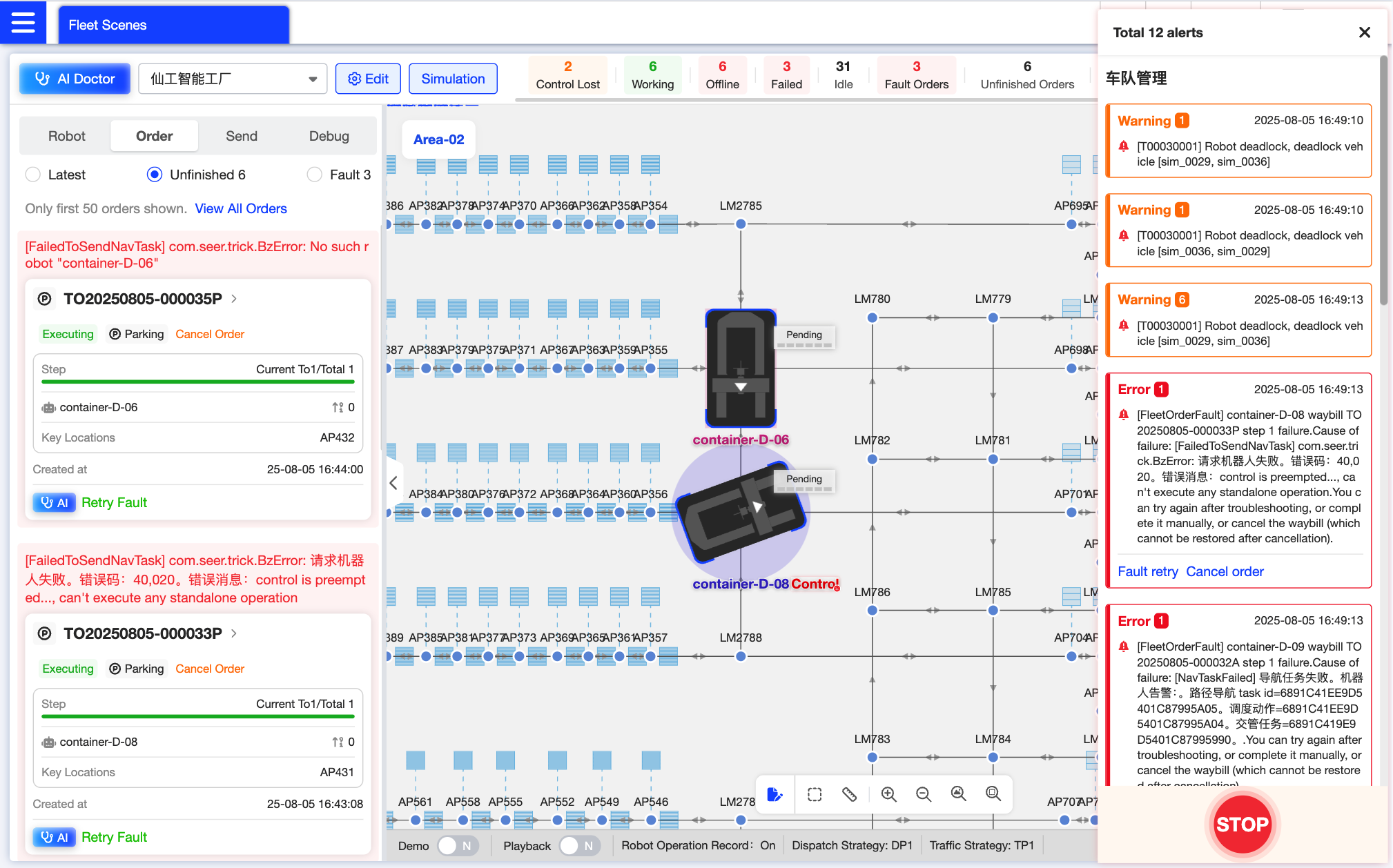 Supports dynamic dispatch, takeover (e.g., nearest order), reallocation, and more flexible dynamic order batching, and order details (e.g., priority, destination) can be updated during execution. The system has high availability that can handle over 1,000 orders/min and more than 10,000 orders/day.