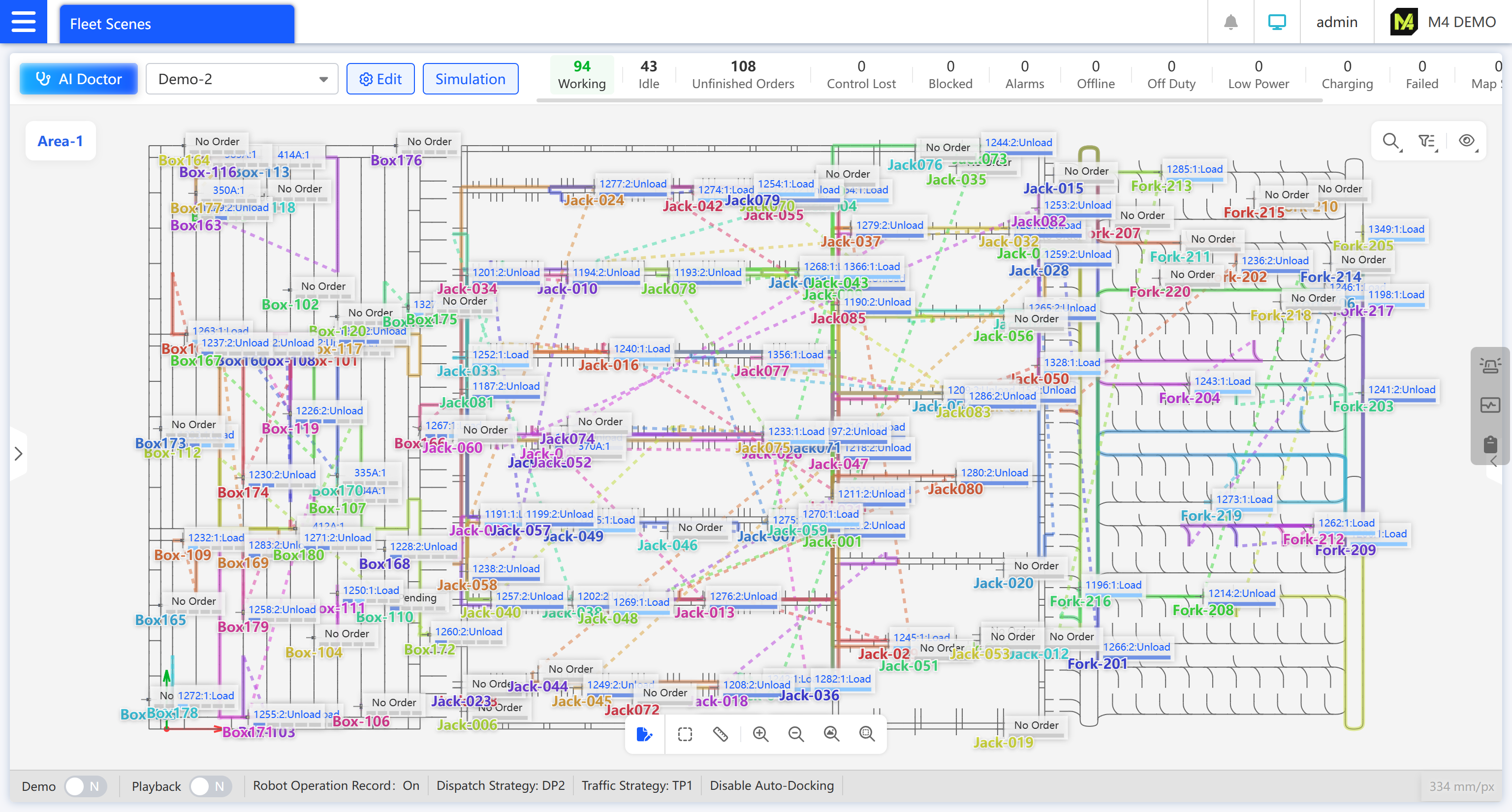 The system features multiple built-in algorithms, such as dispatching, route planning, and traffic control, which can be flexibly switched. Proprietary MAPF algorithms significantly improve planning intelligence and reduce deadlocks. On a non-uniform, partially connected grid map, a single zone can dispatch over 100 robots of different types or more than 300 robots of the same type, with an average movement distance 30% shorter than the previous generation.