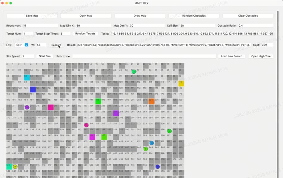 MAPF DEV fully covers the core requirements of the entire scheduling process scenario. It supports flexible adjustment of map size, node size, and obstacle ratio, allowing for quick environment setup through random generation or load/save functions. Meanwhile, it can realize robot generation, random task creation, and intelligent solving, providing multiple scheduling strategy options. Additionally, users can view the real-time operation process of solving simulations and gain in-depth insights into the underlying and high-level solving details, which helps them clearly grasp the scheduling logic and execution principles.