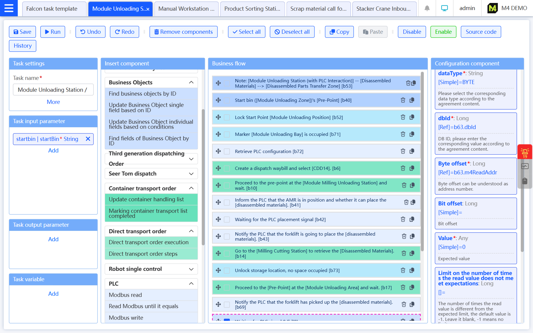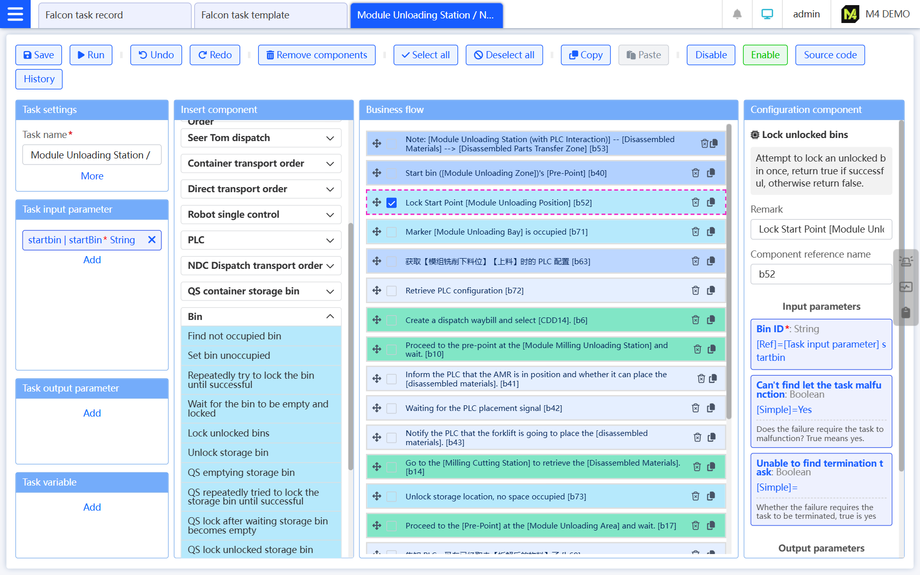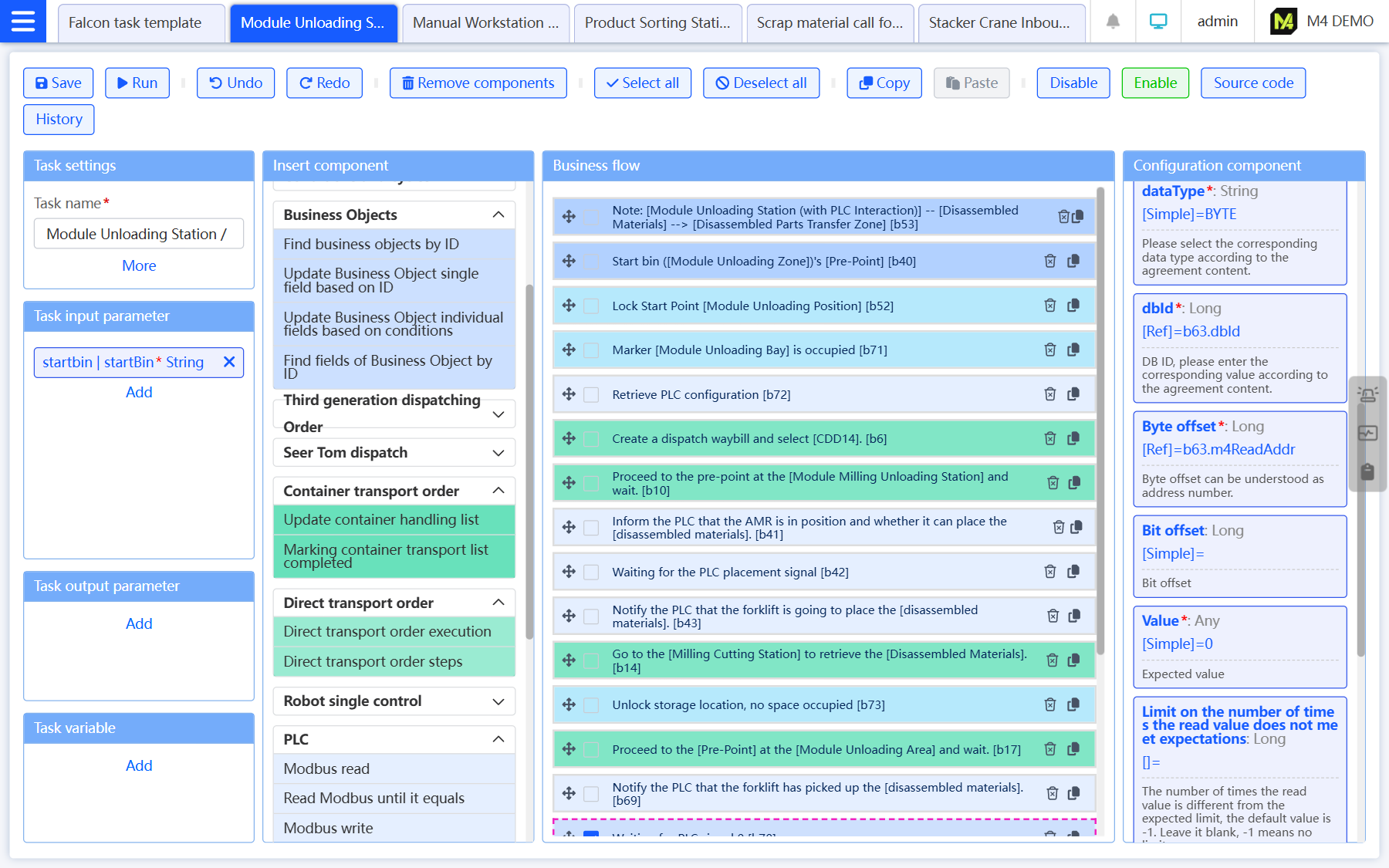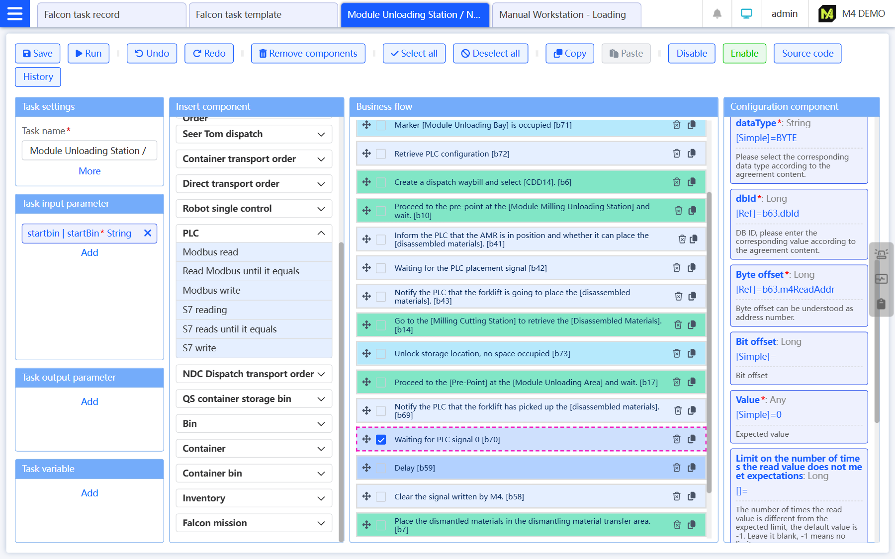 Falcon Task is a low-code task engine within the M4 system. It supports editing task action sequences through a visual interface, allowing users to quickly build complex business flows in a 'building block' style. It not only enables point-to-point transport but also handles complex business processes such as loop processing, parallel processing, multi-point transport, multi-robot collaboration, system interaction, device control, and warehouse inventory logic, like scheduled loading/unloading, replenishing empty pallets, and PLC device integration.