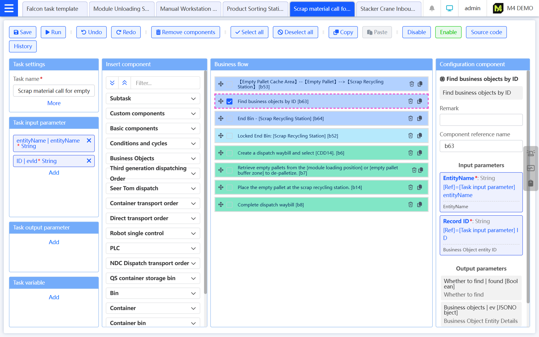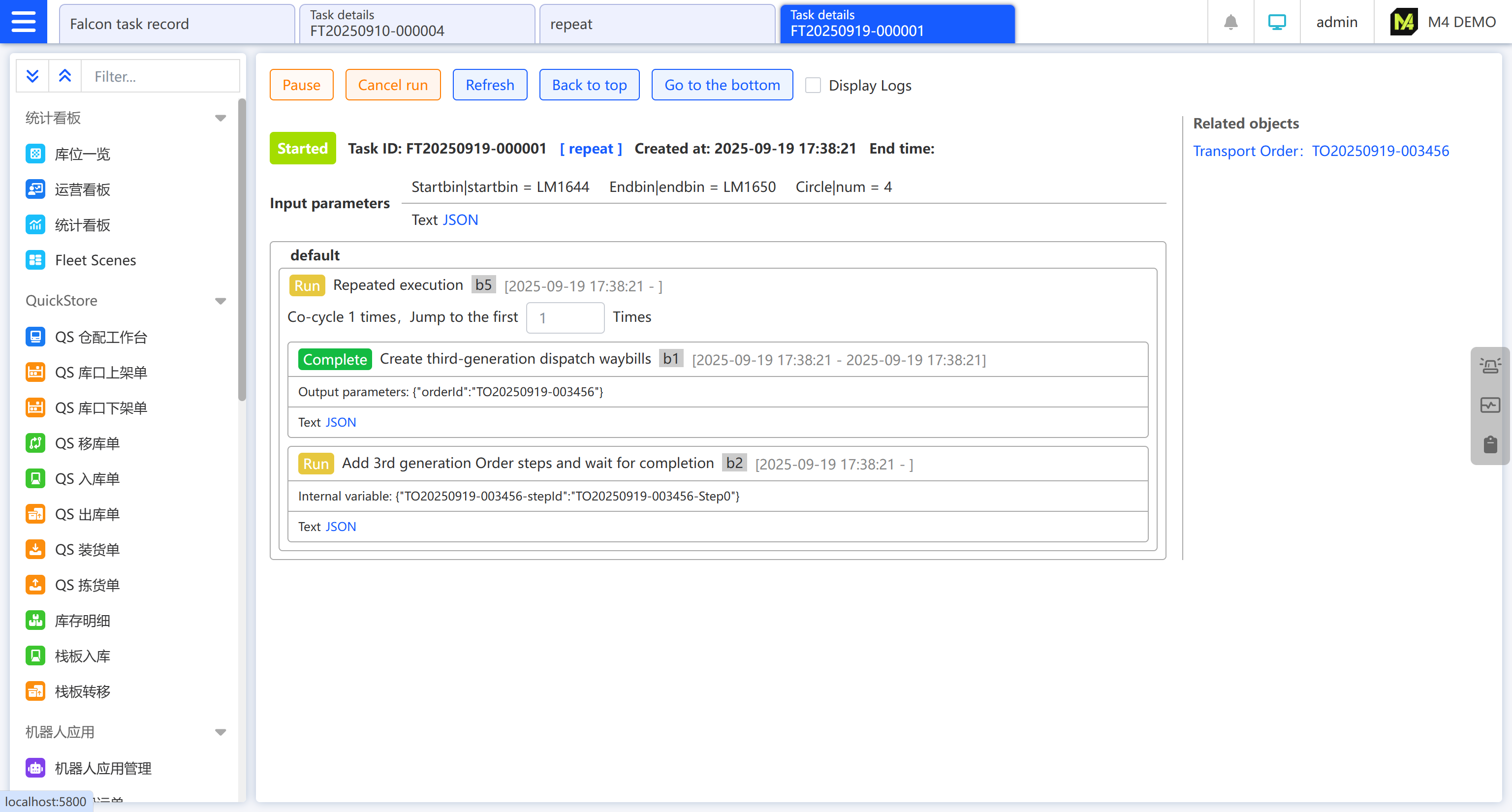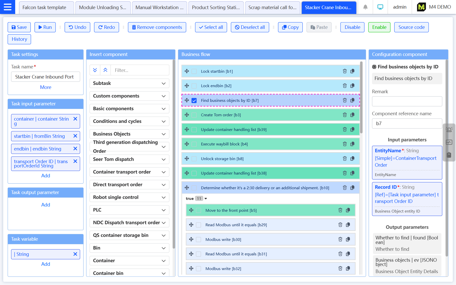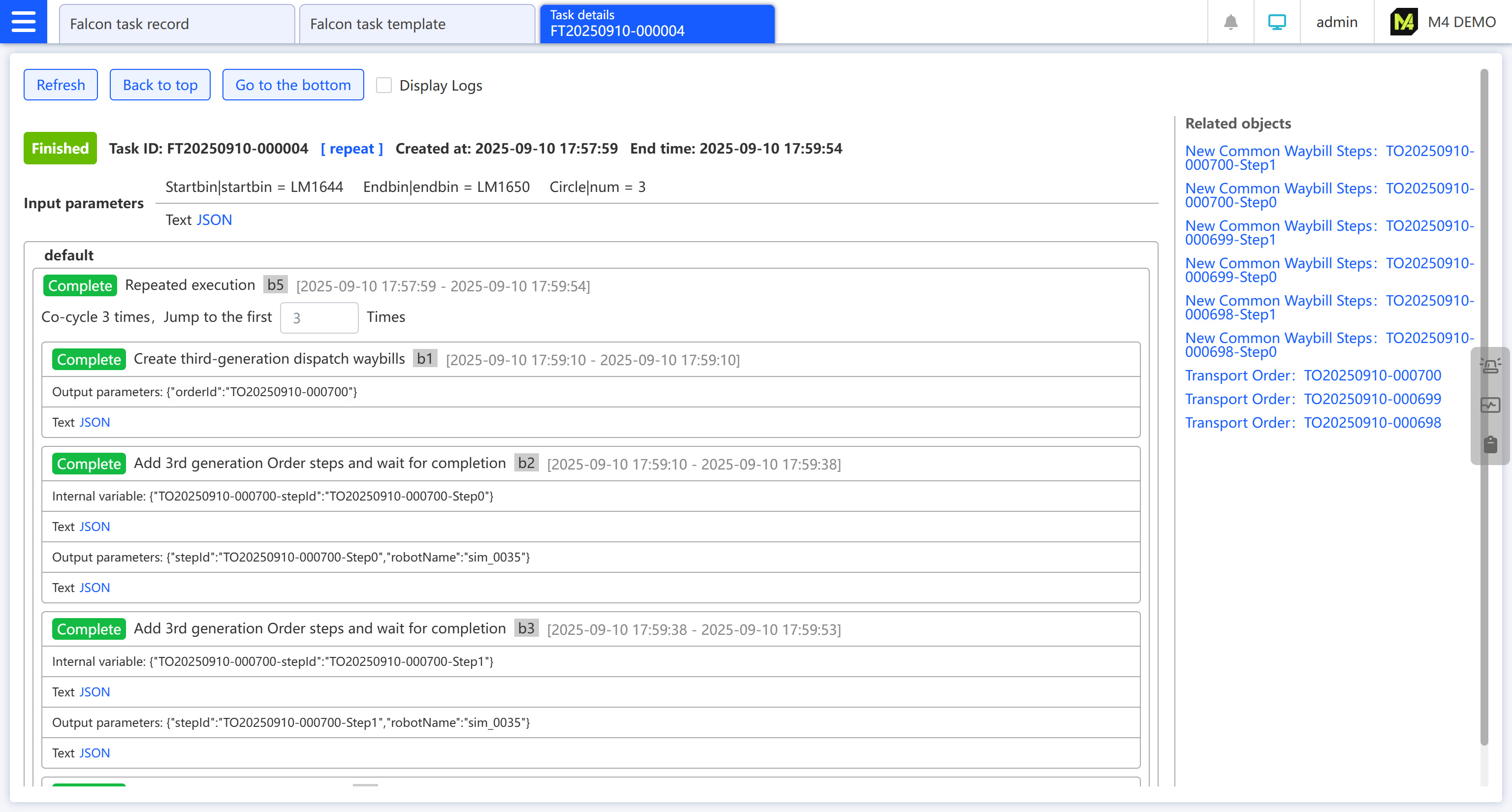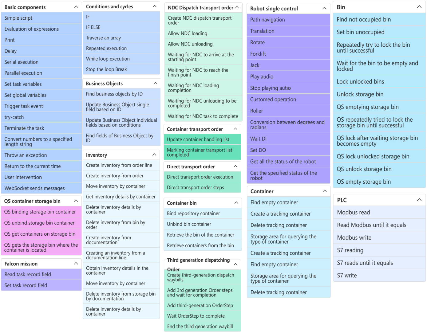 Falcon Task is a low-code task engine within the M4 system. It supports editing task action sequences through a visual interface, allowing users to quickly build complex business flows in a 'building block' style. It not only enables point-to-point transport but also handles complex business processes such as loop processing, parallel processing, multi-point transport, multi-robot collaboration, system interaction, device control, and warehouse inventory logic, like scheduled loading/unloading, replenishing empty pallets, and PLC device integration.
