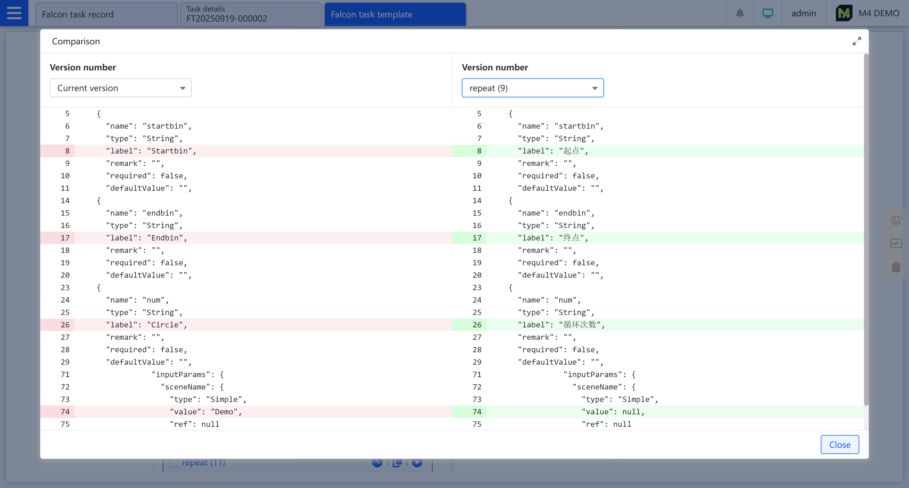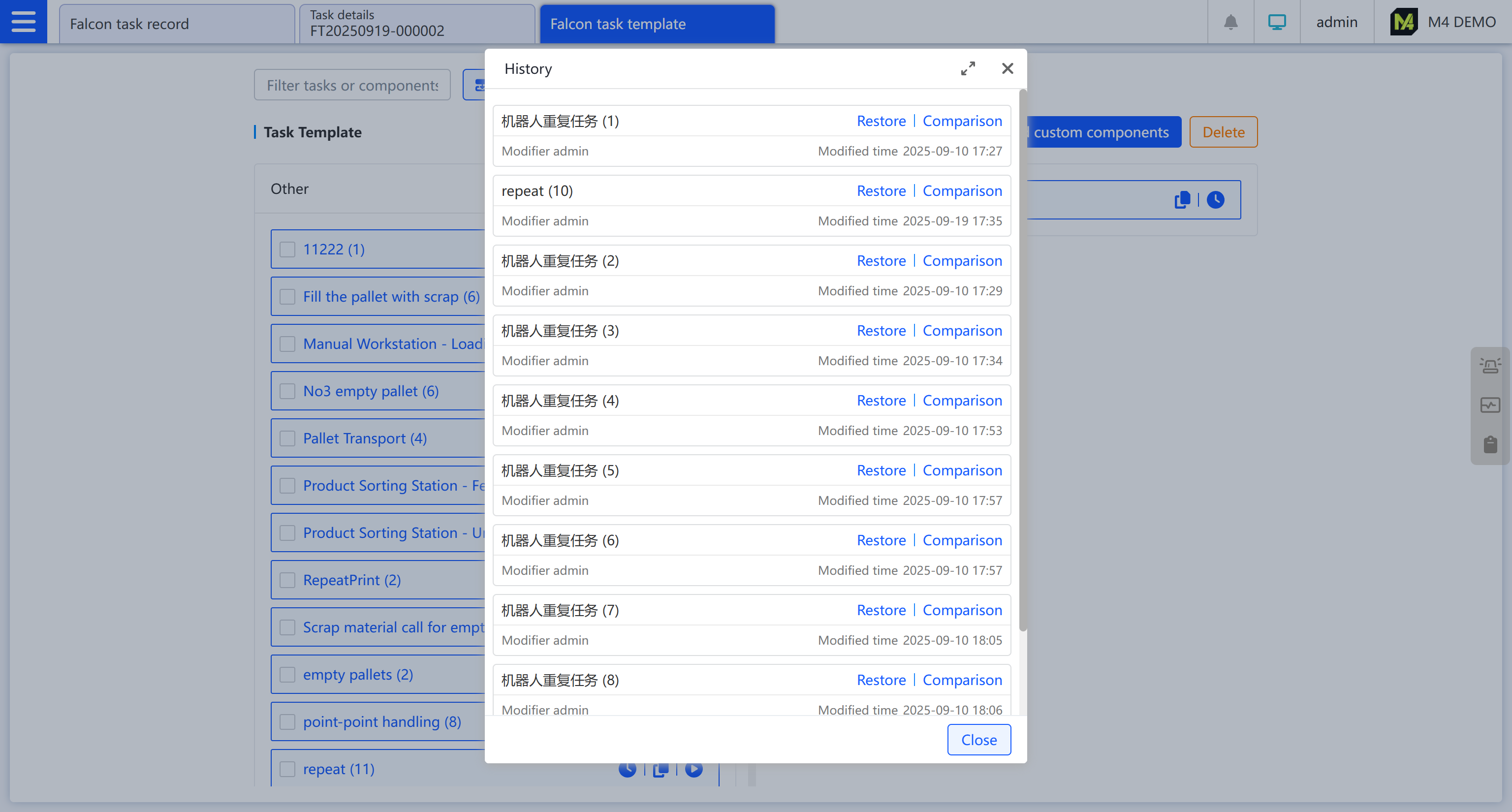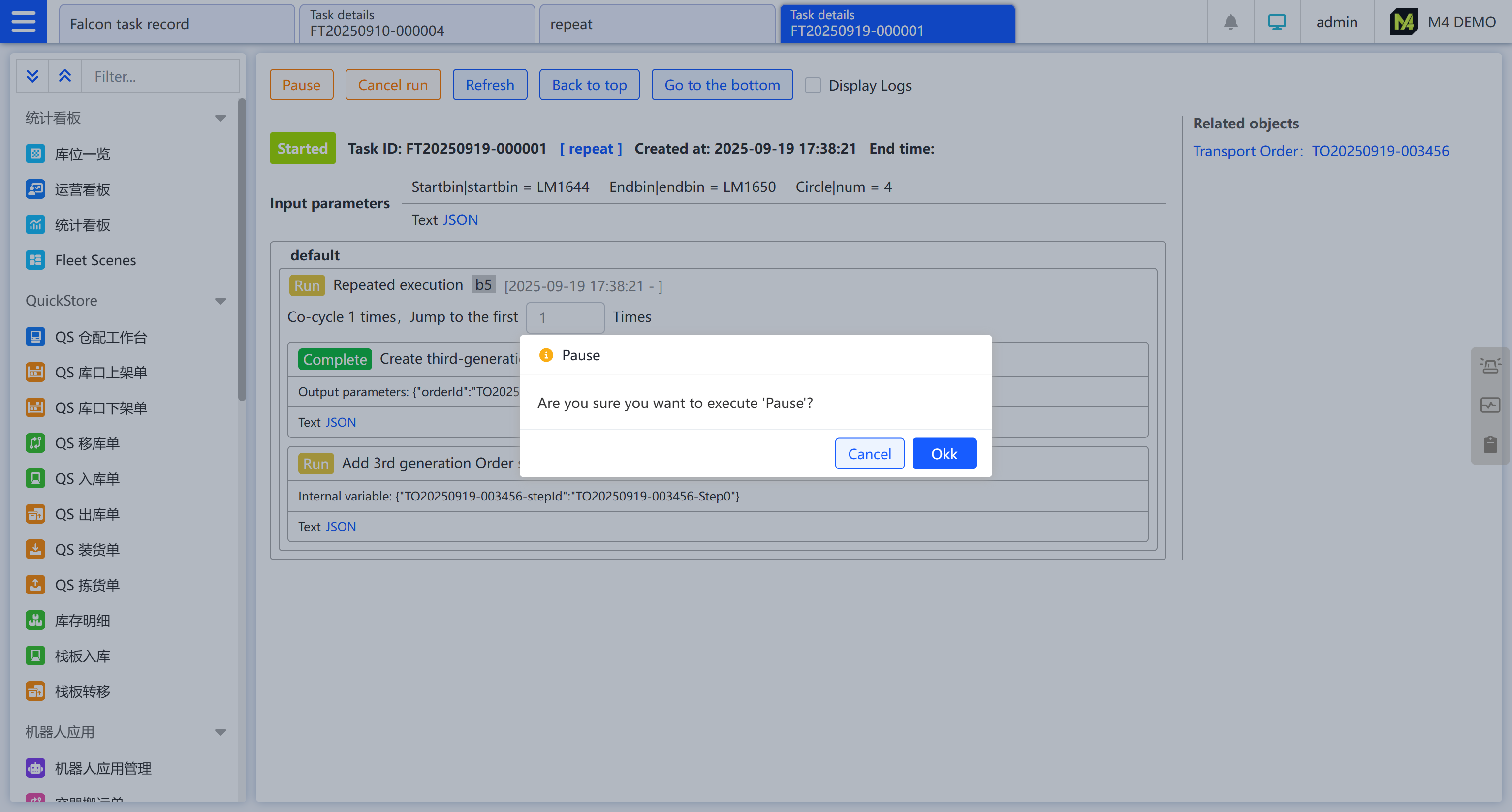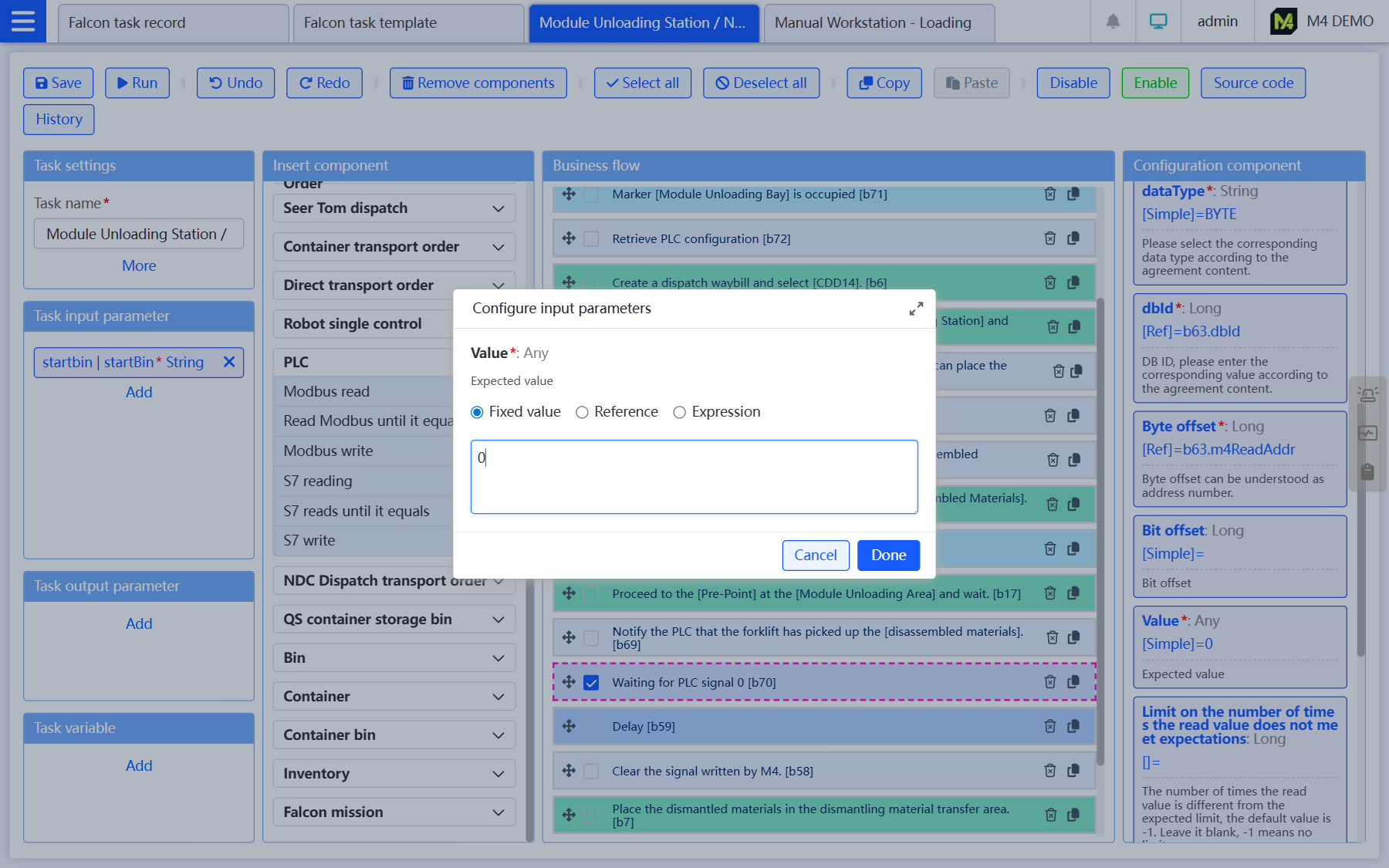 Falcon Task is a low-code task engine within the M4 system. It supports editing task action sequences through a visual interface, allowing users to quickly build complex business flows in a 'building block' style. It not only enables point-to-point transport but also handles complex business processes such as loop processing, parallel processing, multi-point transport, multi-robot collaboration, system interaction, device control, and warehouse inventory logic, like scheduled loading/unloading, replenishing empty pallets, and PLC device integration.