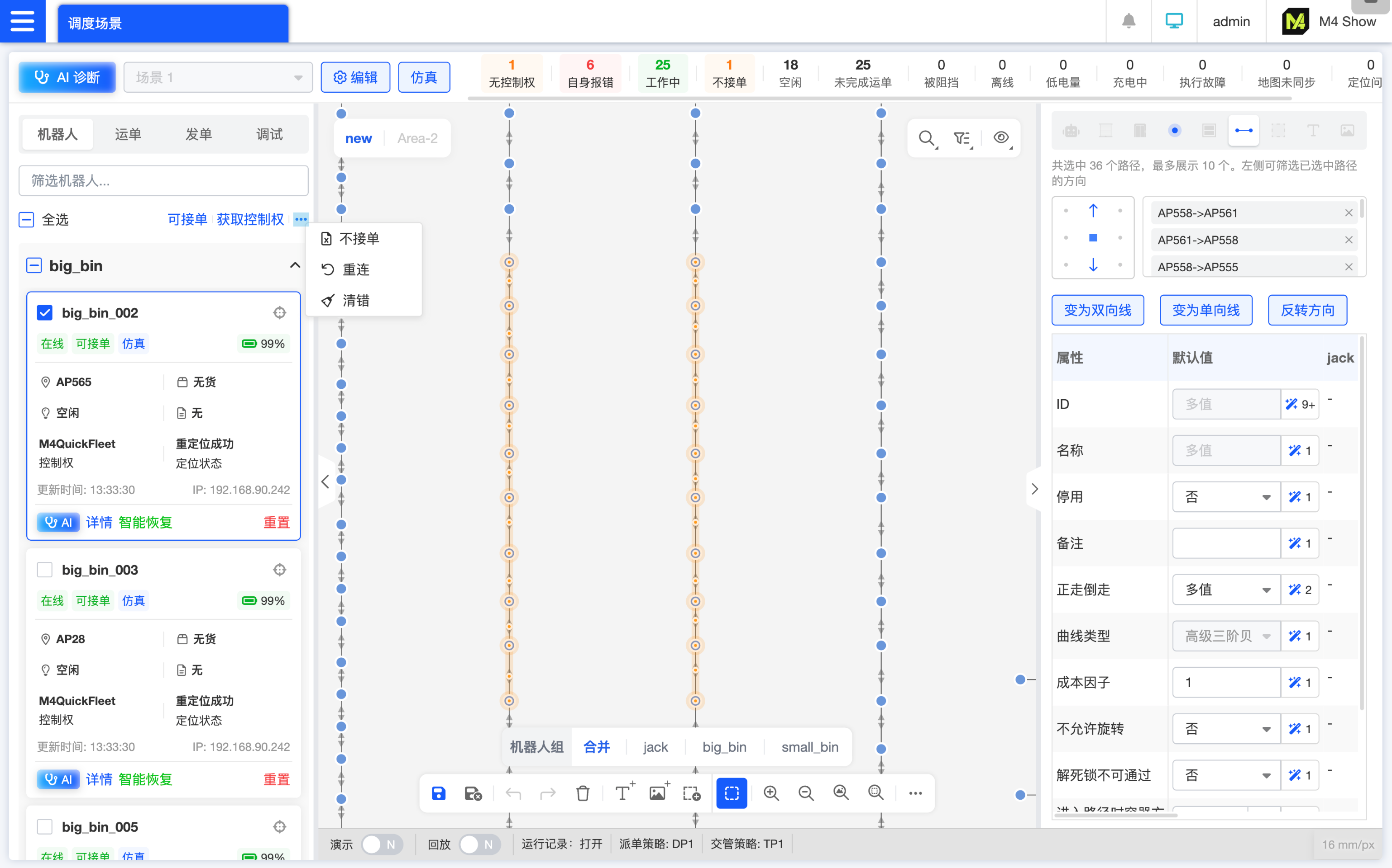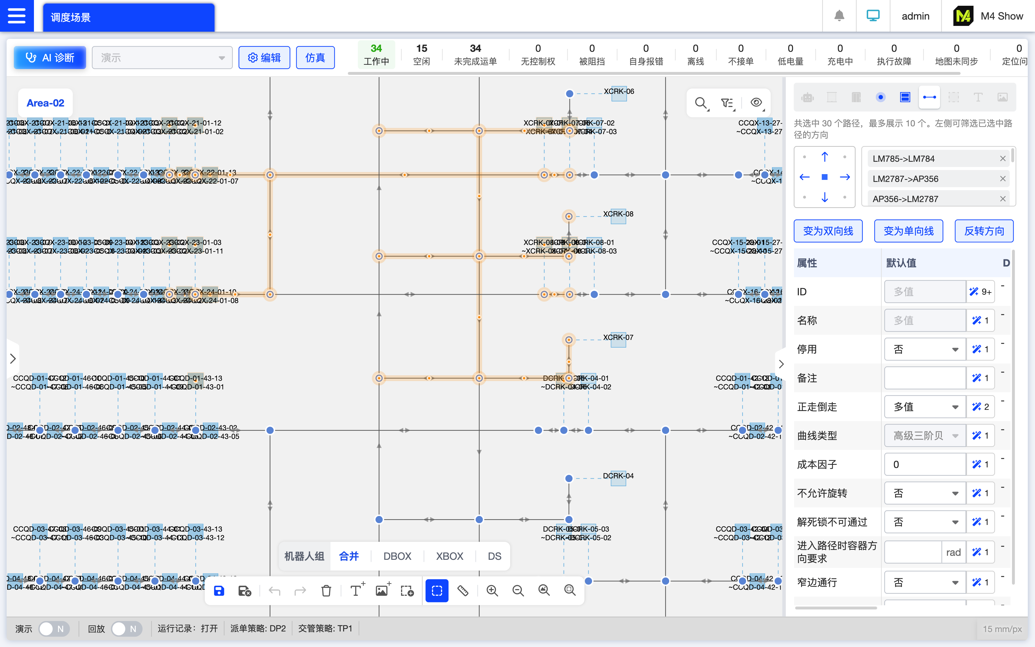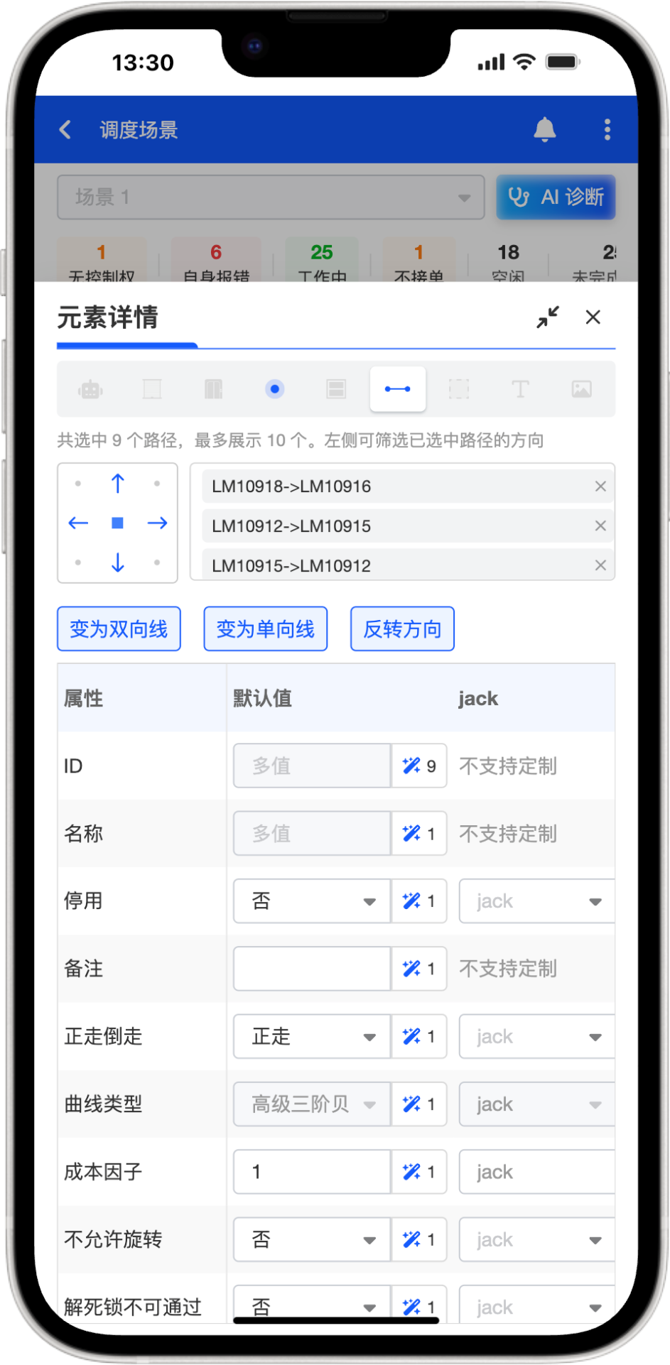 机器人、地图等编辑都支持批量操作,大大提升效率。支持分组定制(如点位坐标)解决多车型一致性问题。支持快速禁用线路等诸多快捷操作。