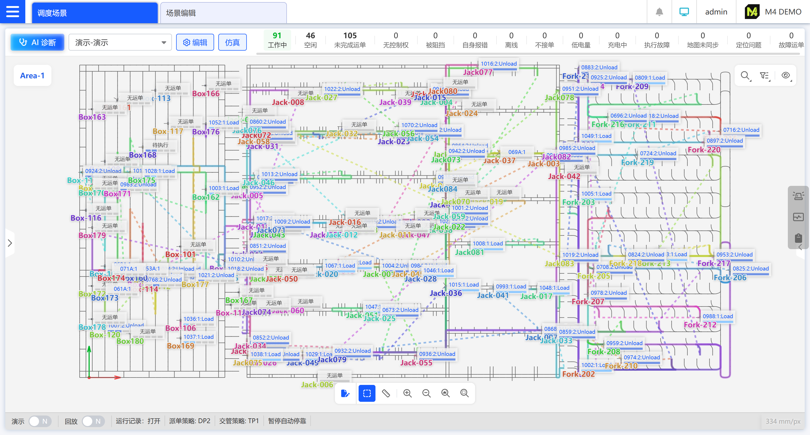 内建多套派单、路径规划、交通管制算法。可根据场景大小等因素切换。自研多套 MAPF 算法,路径规划智能性大幅提高,能基本实现无解不开的死锁或无死锁(冲突)规划(各种类型的死锁目前仍是行业最难的问题之一)。支持单区域多车型 100+ 台机器人调度,单车型 300+ 台机器人调度(真实项目地图,非规整的、不全连通棋盘地图)。机器人平均移动距离相比上一代系统减少 30%。