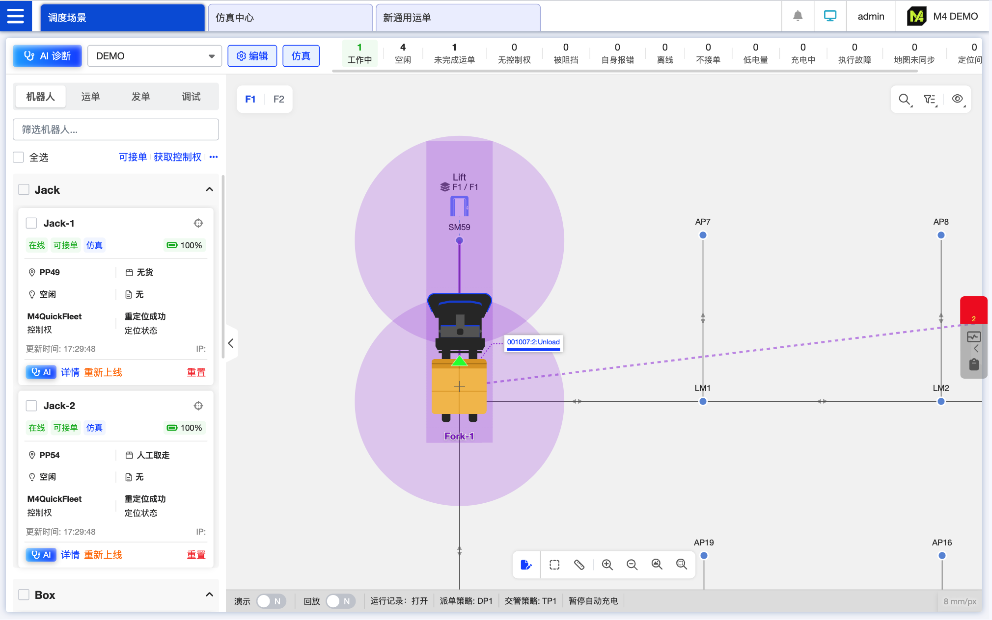 控制更精准,预测更准确。相对于上一代调度,全面支持对不同车型速度、转弯速度、正倒走的规划和预测。具备绕障动态规划等能力。具备完备的货物方向控制功能。支持密集库位下的调度。