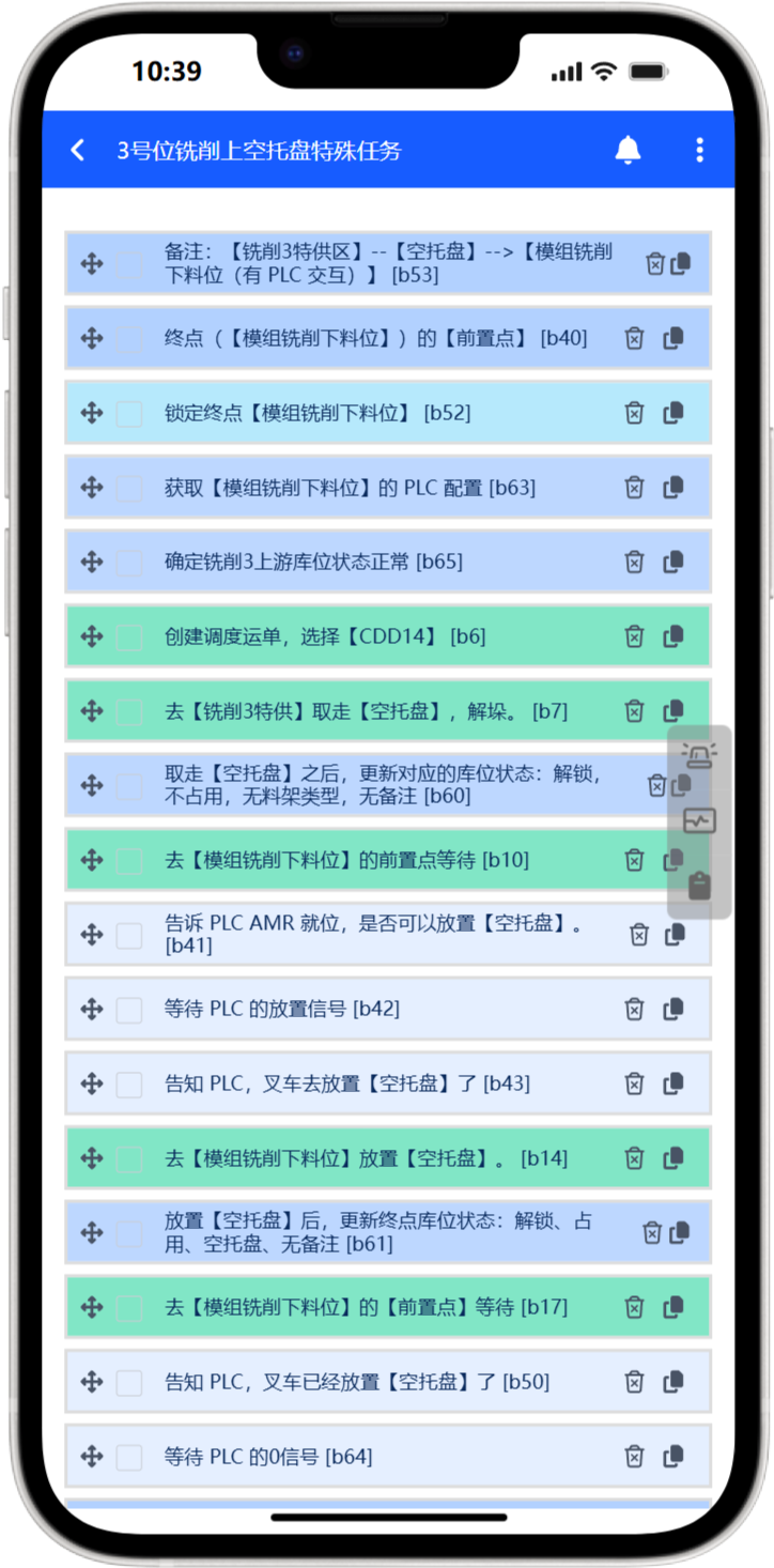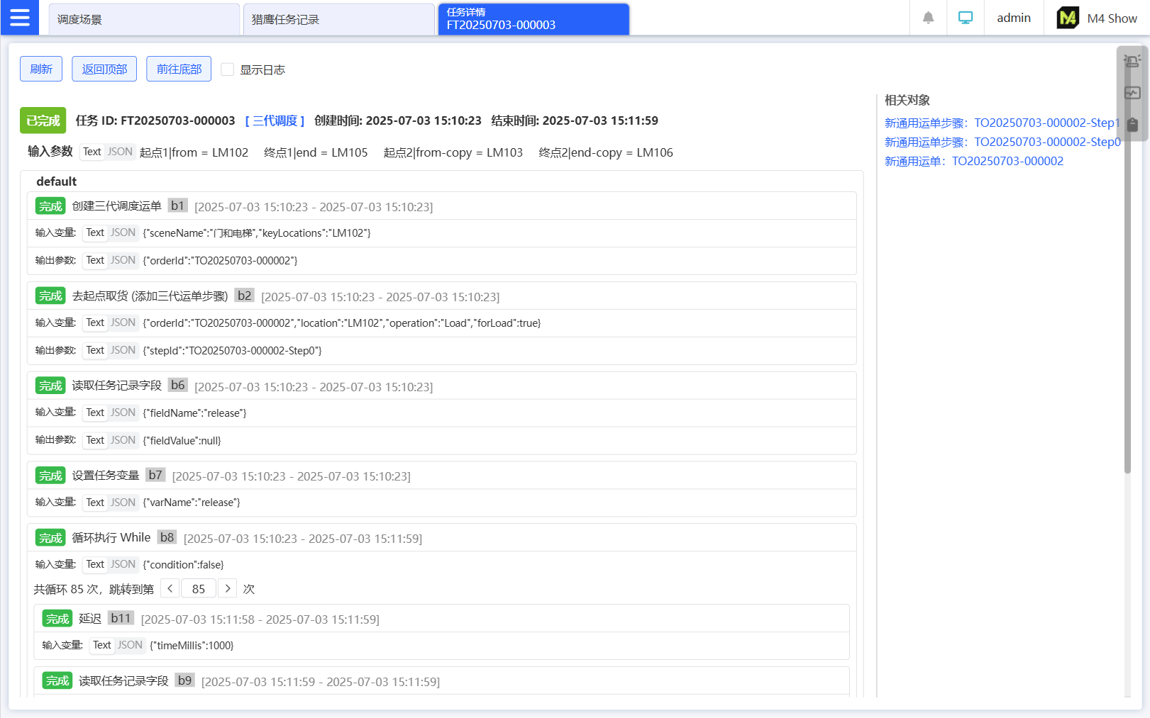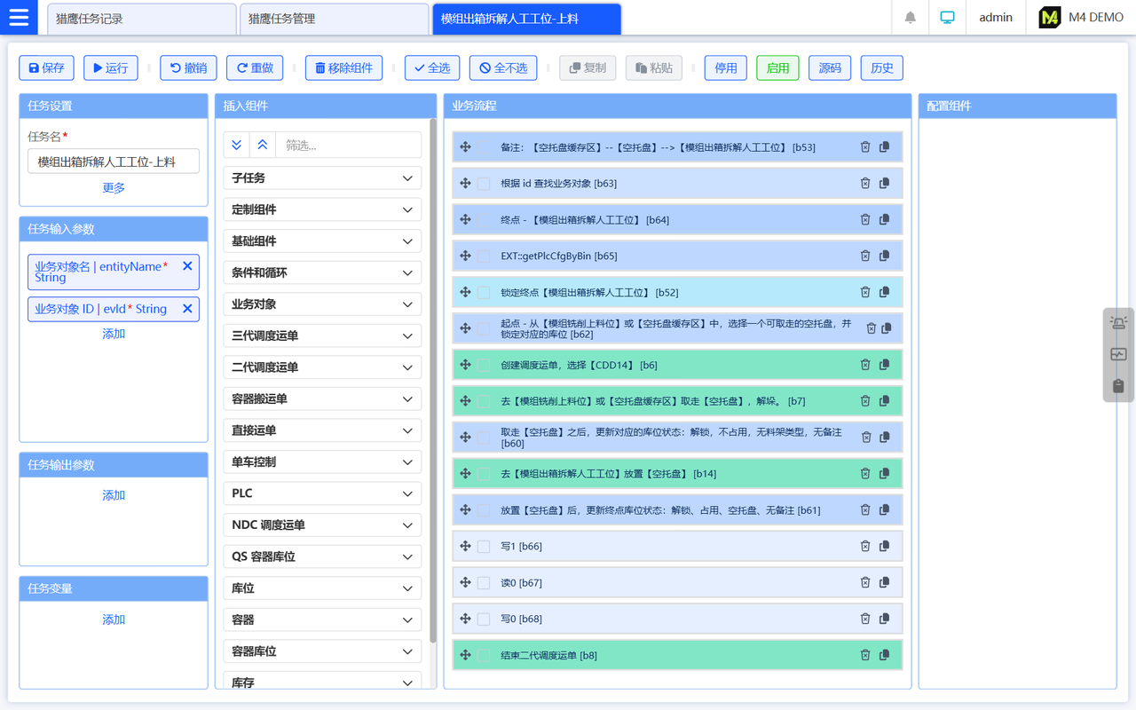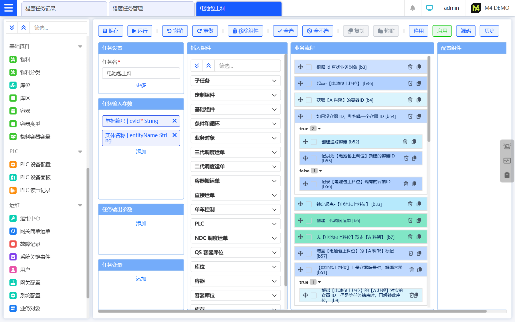 猎鹰任务是 M4 系统的低代码任务引擎,支持通过可视化界面编辑任务动作序列,以类似于搭积木的形式,快速实现复杂的业务流。不仅能实现点对点搬运,还可以实现循环处理、并行处理、多点搬运、多车协作、系统交互、设备控制、库存仓储逻辑等复杂业务流程,如定时上下料、补充空托盘、PLC 设备对接等。