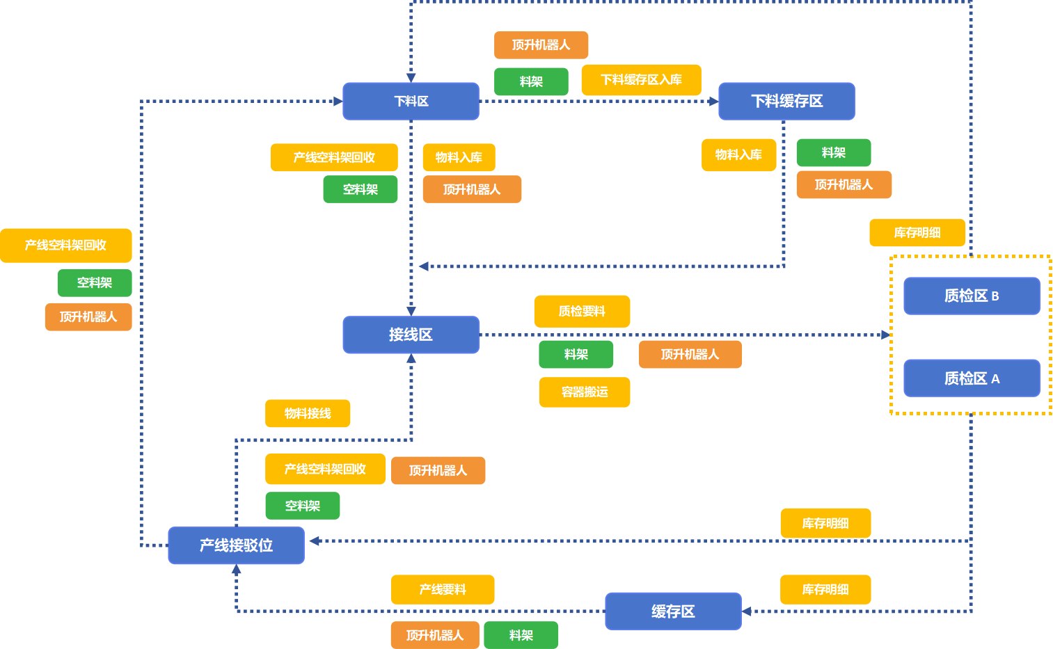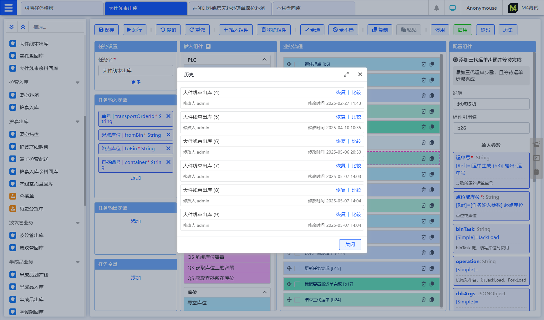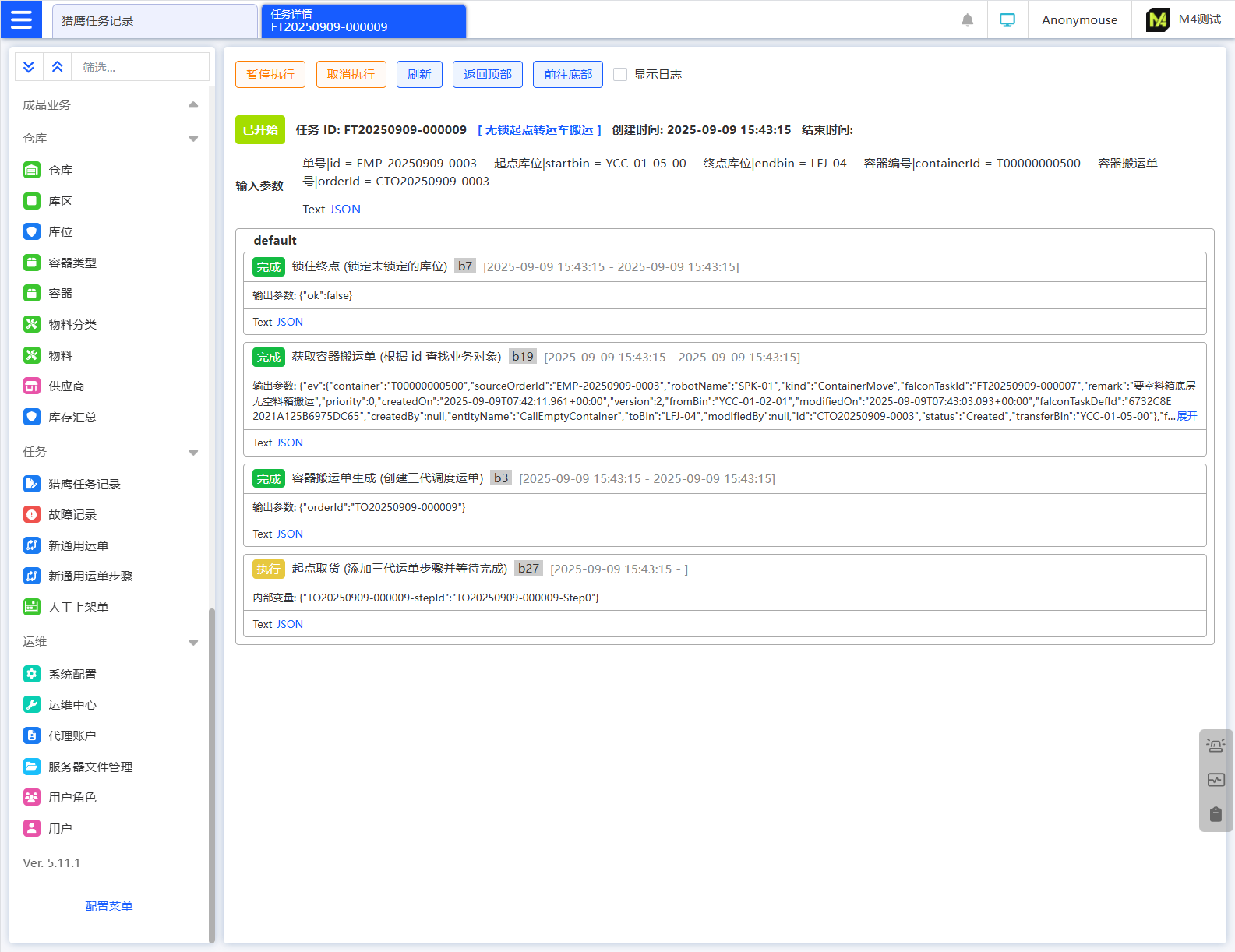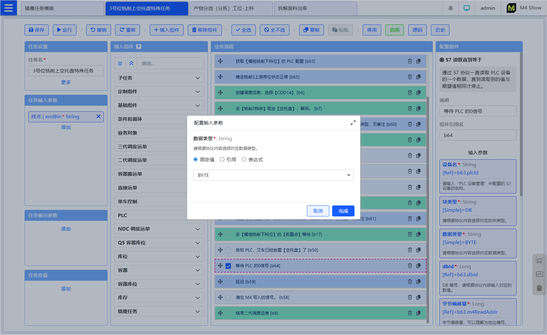 猎鹰任务是 M4 系统的低代码任务引擎,支持通过可视化界面编辑任务动作序列,以类似于搭积木的形式,快速实现复杂的业务流。不仅能实现点对点搬运,还可以实现循环处理、并行处理、多点搬运、多车协作、系统交互、设备控制、库存仓储逻辑等复杂业务流程,如定时上下料、补充空托盘、PLC 设备对接等。