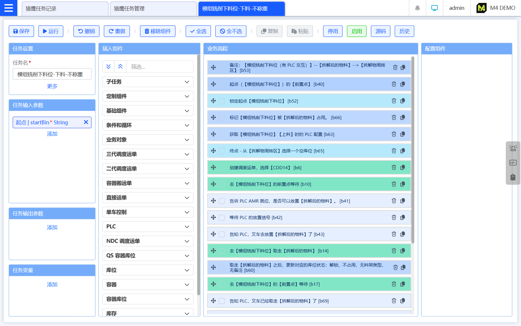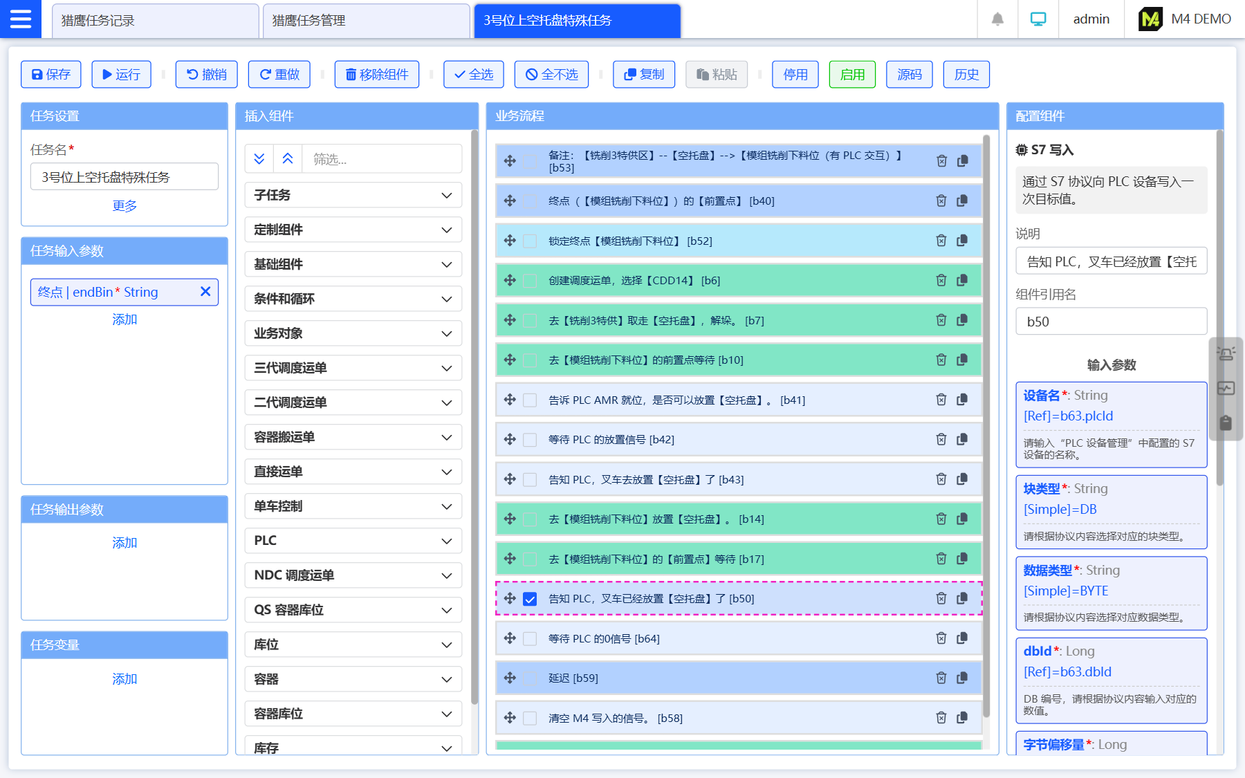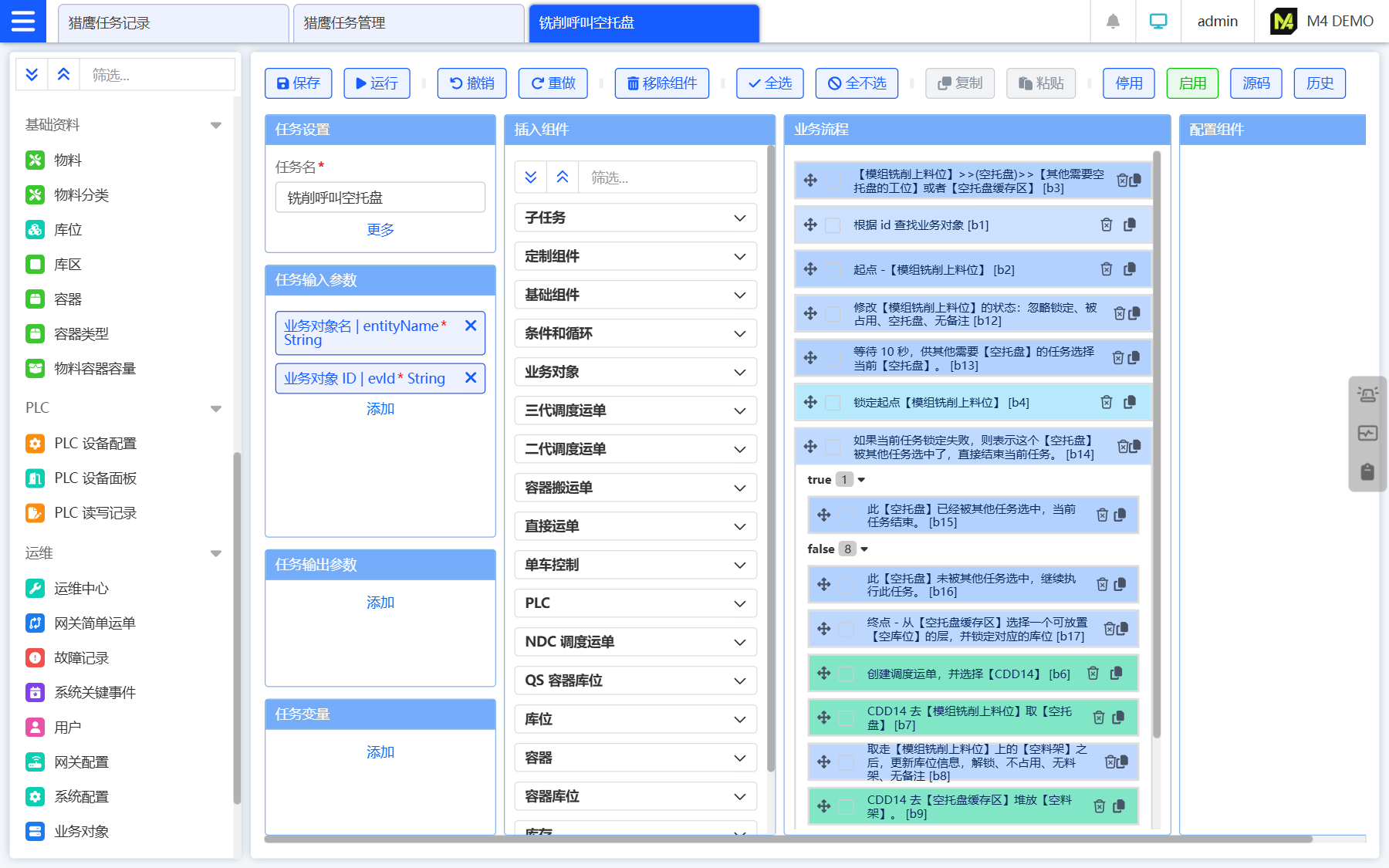 机器人调度只能实现相对标准的功能,如机器人管控、运单派发、路径规划和交通管制、门电梯等关键设备管控。但实际业务需求通常是非标的,特别是在工业场景下,每个场景的物流需求是高度差异化的。M4 猎鹰任务通过 Python 脚本扩展系统能力,与 M4 调度融合,可以可视化地编排业务流程,实现各类非标需求。例如,取货前与滚筒线等 PLC 交互,放货后告知某个第三方系统,根据设备是否繁忙选择不同终点,根据货物类型定制复杂的库位选择逻辑等。