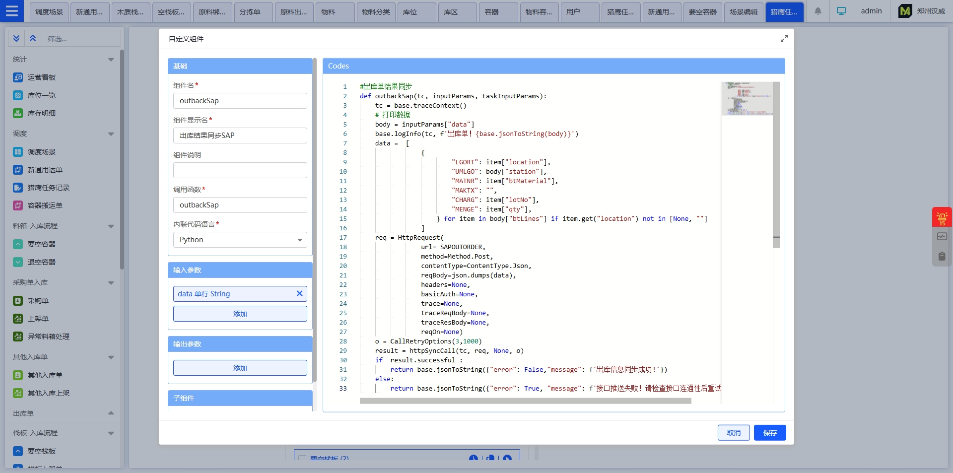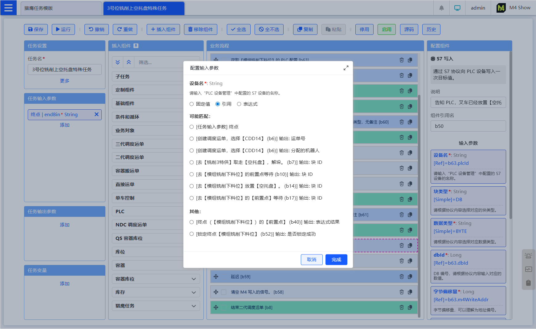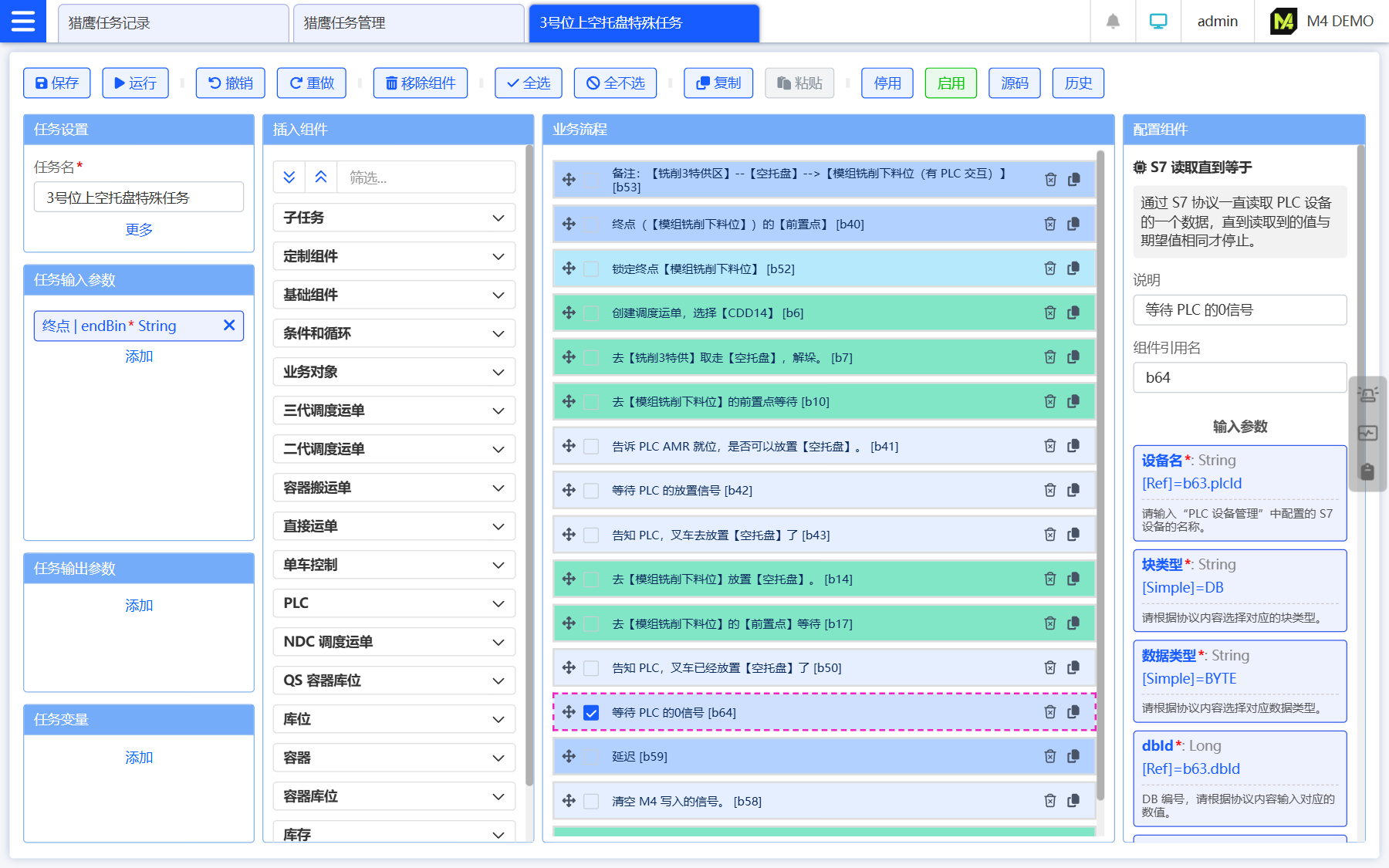 机器人调度只能实现相对标准的功能,如机器人管控、运单派发、路径规划和交通管制、门电梯等关键设备管控。但实际业务需求通常是非标的,特别是在工业场景下,每个场景的物流需求是高度差异化的。M4 猎鹰任务通过 Python 脚本扩展系统能力,与 M4 调度融合,可以可视化地编排业务流程,实现各类非标需求。例如,取货前与滚筒线等 PLC 交互,放货后告知某个第三方系统,根据设备是否繁忙选择不同终点,根据货物类型定制复杂的库位选择逻辑等。