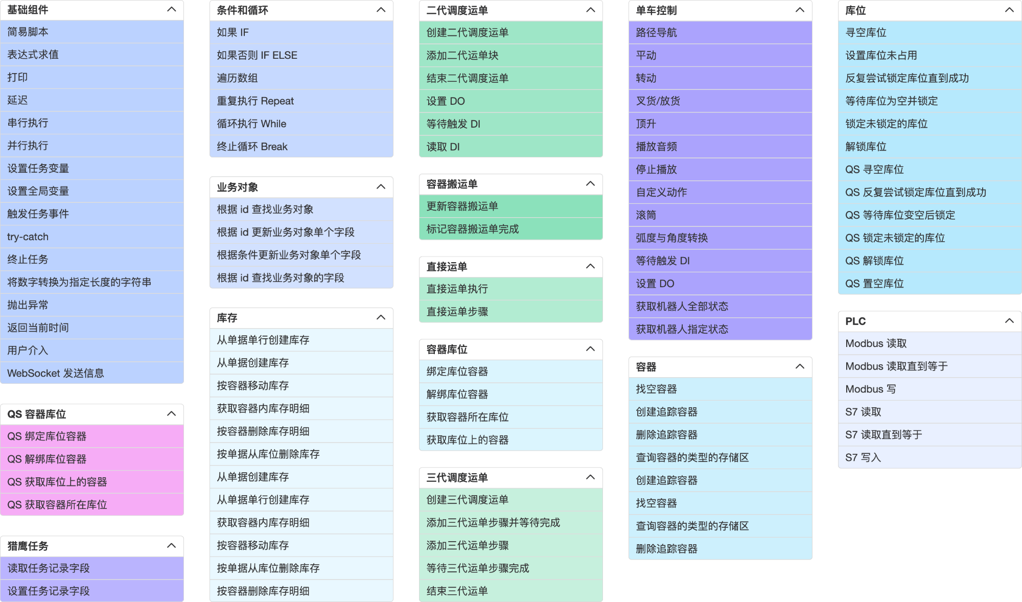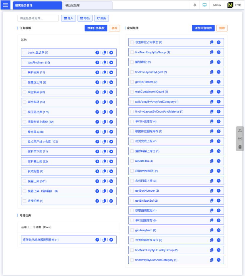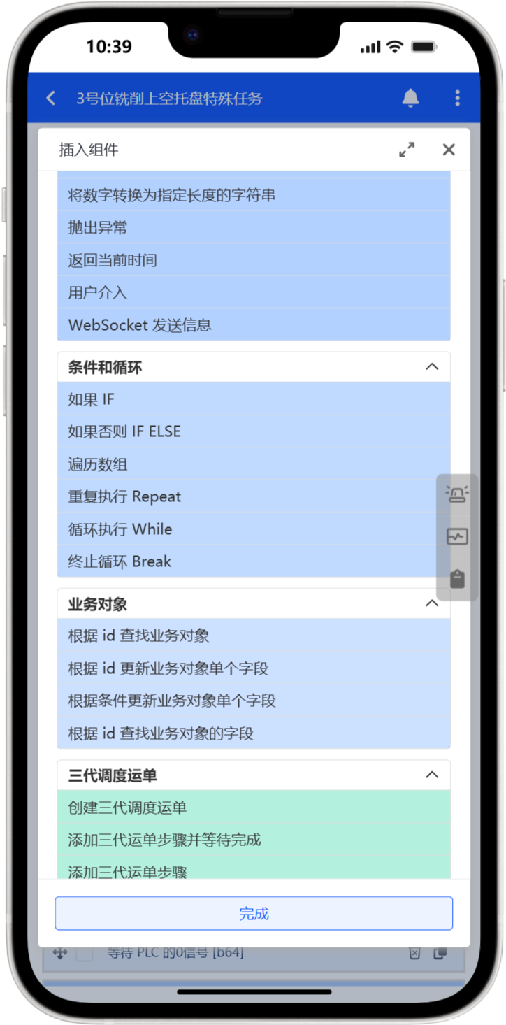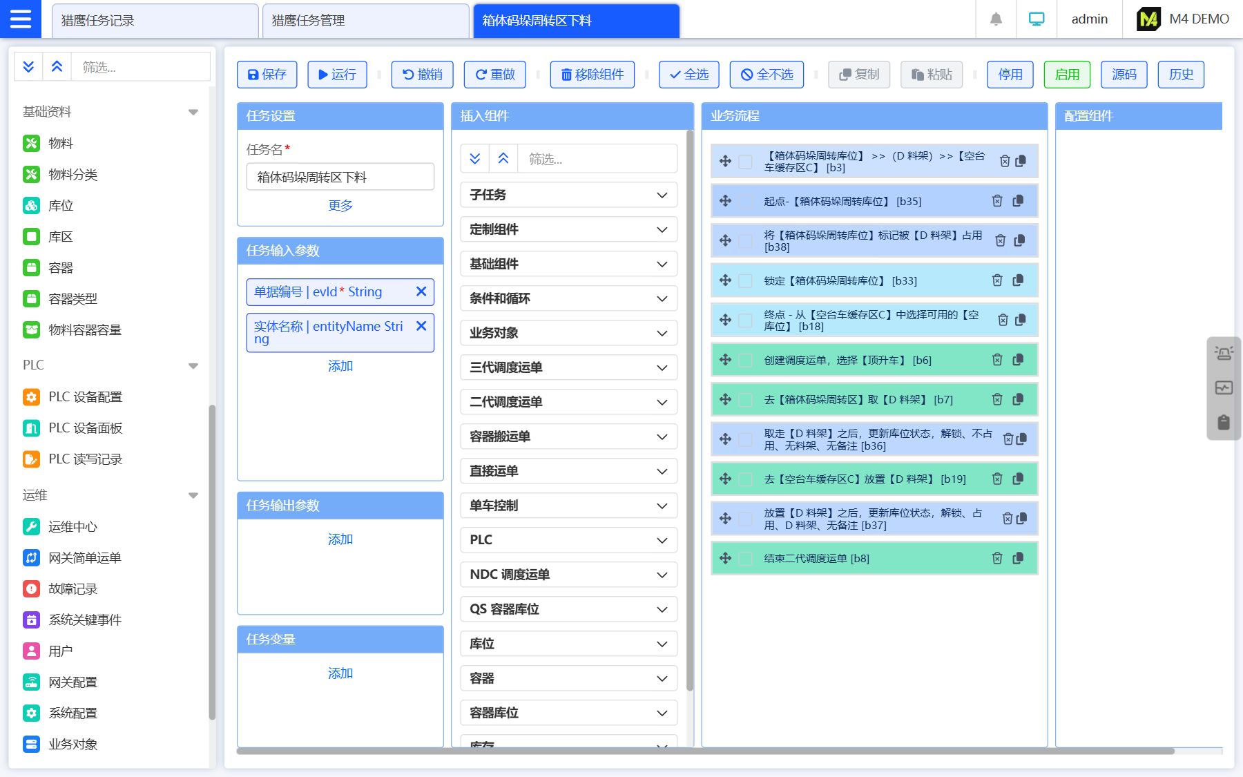 猎鹰任务编辑页面内嵌组件覆盖广,除基础组件外,还包含调度、库存、容器、PLC、条件和循环等维度,如创建调度运单、按容器移动库存、Modbus 读取、重复执行 Repeat 等,支持用户各类复杂业务逻辑。